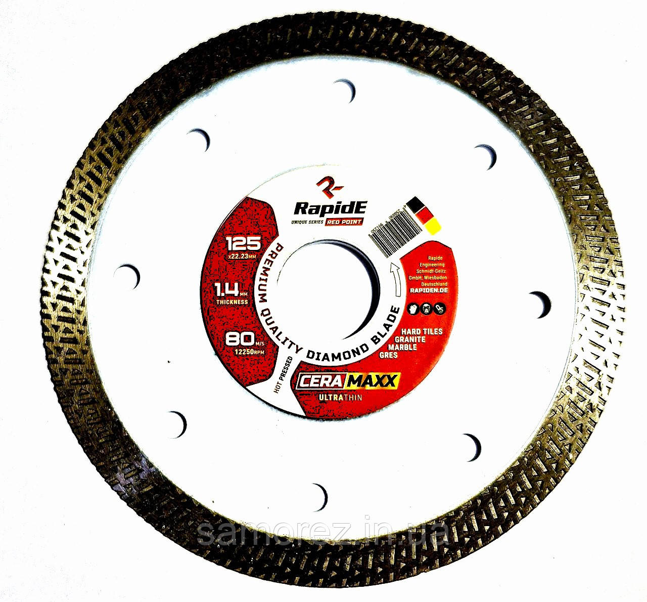 Алмазний диск Rapide "CERAMAXXX" 125мм використовується для ультратонкого та високошвидкісного різання різних будівельних матеріалів. Ультратонке лезо товщиною 1,4мм виготовлене методом гарячого пресування та має алмазний сегмент B-turbo висотою 10мм. Такий диск призначений для різання таких матеріалів як: